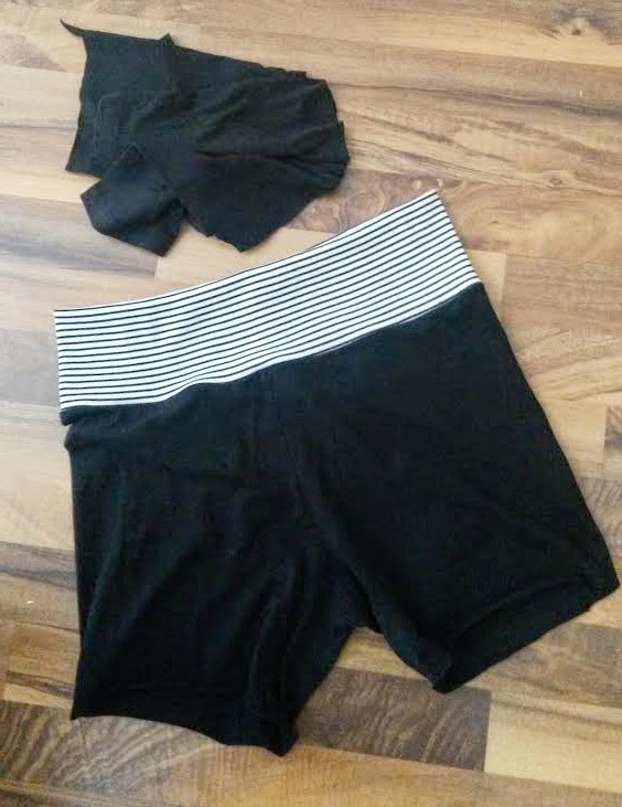 Satun kuulumaan niihin paksureitisiin ihmisiin, joilla iho hankautuu kipeästi, jos on vähänkään hiki, eikä mitään välissä. Kaapista löytyi jossain mielenhäiriössä ostetut trikoolegginssit. Nappasin lahkeita reilusti lyhyemmäksi ja leikkelin ylijäämäpalat kertakäyttörättilaatikkoon. Raskausmahaa kiristävän vyötärönauhan leikkasin pois ja laitoin tilalle pätkän resoria, jolloin sain vyötärön myös hieman korkeammaksi. Näillä 30 asten helteillä en halunnut masun päälle tulevaa tuubia, vaan jätin vyötärön suosiolla kauas navan alle. Lahkeensuille en tehnyt nyt toistaiseki mitään, jotta siihen ei tule mitään epämiellyttävän paksua kohtaa. Näiden on tarkoitus pelastaa elämäni kesämekon alla, kun en halua tunkea itseäni sukkahousuihin.